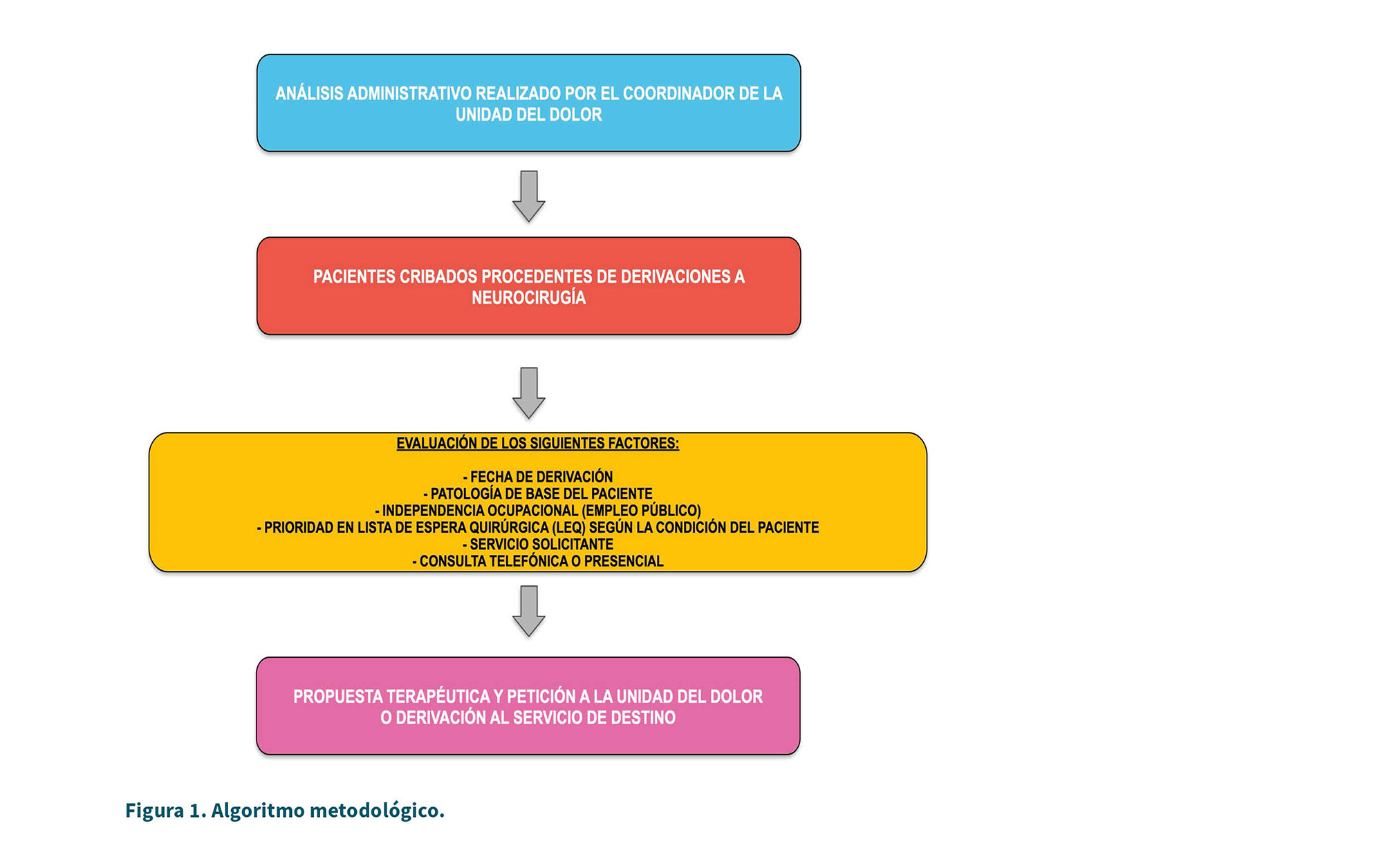 El protocolo asistencial inicial era muy sencillo: se realizó un análisis administrativo por parte del coordinador de la unidad del dolor, a modo de “primera criba” para derivar a la ruta clínica pertinente. Los factores determinantes se detallan en la Figura 1. La codificación administrativa se consideró potencialmente heterogénea y no se utilizó como fuente primaria de clasificación.