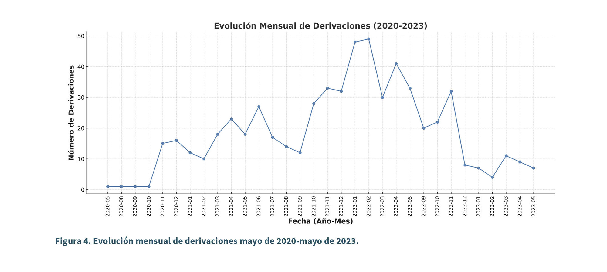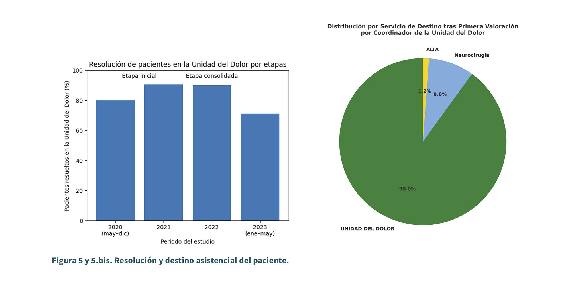 El volumen de derivaciones creció según avanzó el tiempo del estudio: 35 casos en 2020 (mayo a diciembre), 244 en 2021, 283 en 2022 y 38 desde enero hasta mayo de 2023 (Figura 4). Paralelamente cambió el destino asistencial: en 2020 el 80 % se resolvió en la unidad del dolor; esta proporción aumentó hasta un 90,6 % en 2021 y un 89,9 % en 2022, con un leve descenso al 71 % en el periodo enero-mayo de 2023. Globalmente, 515 de 600 pacientes (88,4 %) recibieron manejo exclusivo en la unidad del dolor, 53 (8,9 %) fueron remitidos finalmente a neurocirugía para valoración quirúrgica y el resto quedó en observación (Figura 5 y 5.bis).