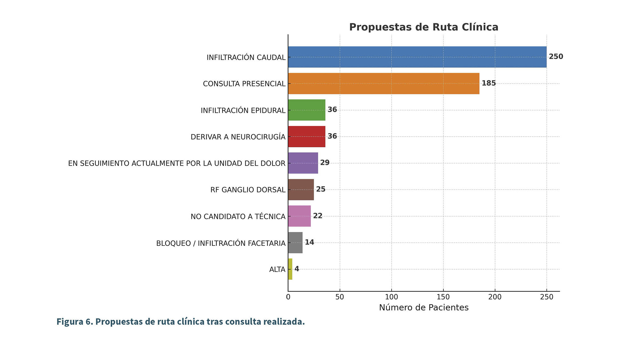La redistribución de cargas asistenciales parece haber sido efectiva incluso en pacientes de mayor complejidad. Este hallazgo es concordante con las guías clínicas internacionales que recomiendan vías progresivas de manejo del dolor crónico, enfatizando el acceso precoz a técnicas mínimamente invasivas para evitar la progresión sintomática y la cronificación (13,14).