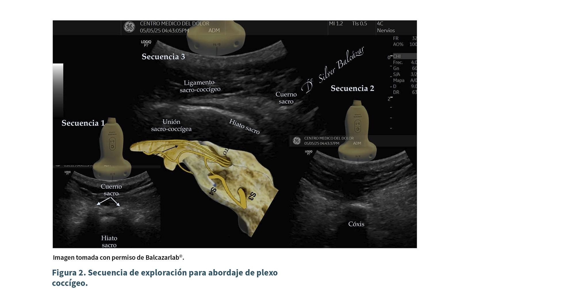 Previamente a la firma de consentimiento informado para anestesia, procedimiento intervencionista, tomas de fotografías con fines de publicación y aviso de privacidad, se colocó en decúbito prono con las extremidades pélvicas en abducción y rotación interna para relajar la musculatura glútea y exponer mejor el hiato sacro. Bajo técnica estéril y monitorización ASA, se realizó rastreo ecográfico con transductor convexo de baja frecuencia 3 a 5 mHz, sonosite PX©, con funda estéril marca EVA© (Figura 2). Se coloca el transductor en posición transversal sobre el sacro y se alinea hasta identificar los cuernos sacros y el ligamento sacrococcígeo (Figura 2, secuencia 1), acto seguido se desplaza el transductor en posición transversal hacia caudal para perder los cuernos del sacro y visualizar la línea hiperecogénica semicircular que corresponde al cóccix (Figura 2, secuencia 2), se rota el transductor en posición longitudinal para evaluar además el cuerno del sacro, ligamento sacrococcígeo, y la unión sacrococcígea e intercoccígea (Figura 2, secuencia 3). El ingreso se realiza colocando el transductor conexo alineado con el cuerno sacro derecho, justo en el borde del cóccix y se introduce con cánula de RF (18 G, punta curva, 10 cm, 10 mm de punta activa) en plano de caudal a cefálico, 3 cm caudal al traductor para una adecuada visualización de la aguja, se punciona hasta alcanzar la unión sacrococcígea, procurando que la punta activa (curva) contacte en paralelo al periostio), se avanza la aguja apenas unos milímetros cefálico a la unión sacrococcígea. Se repite el mismo procedimiento alineando de lado izquierdo con el cuerno sacro izquierdo, justo en el borde izquierdo del cóccix (Figura 3). Para fines de validación de esta descripción de la técnica, se realiza comprobación fluoroscópica en AP y lateral. Visualizando las cánulas en posición paralela y a la misma altura en AP (Figura 4), la comprobación lateral por fluoroscopia permite la visualización de las cánulas paralelas al periostio y sobre la unión sacrococcígea. Se nota además que la punta activa queda justo cefálico a la unión sacrococcígea (Figura 5).