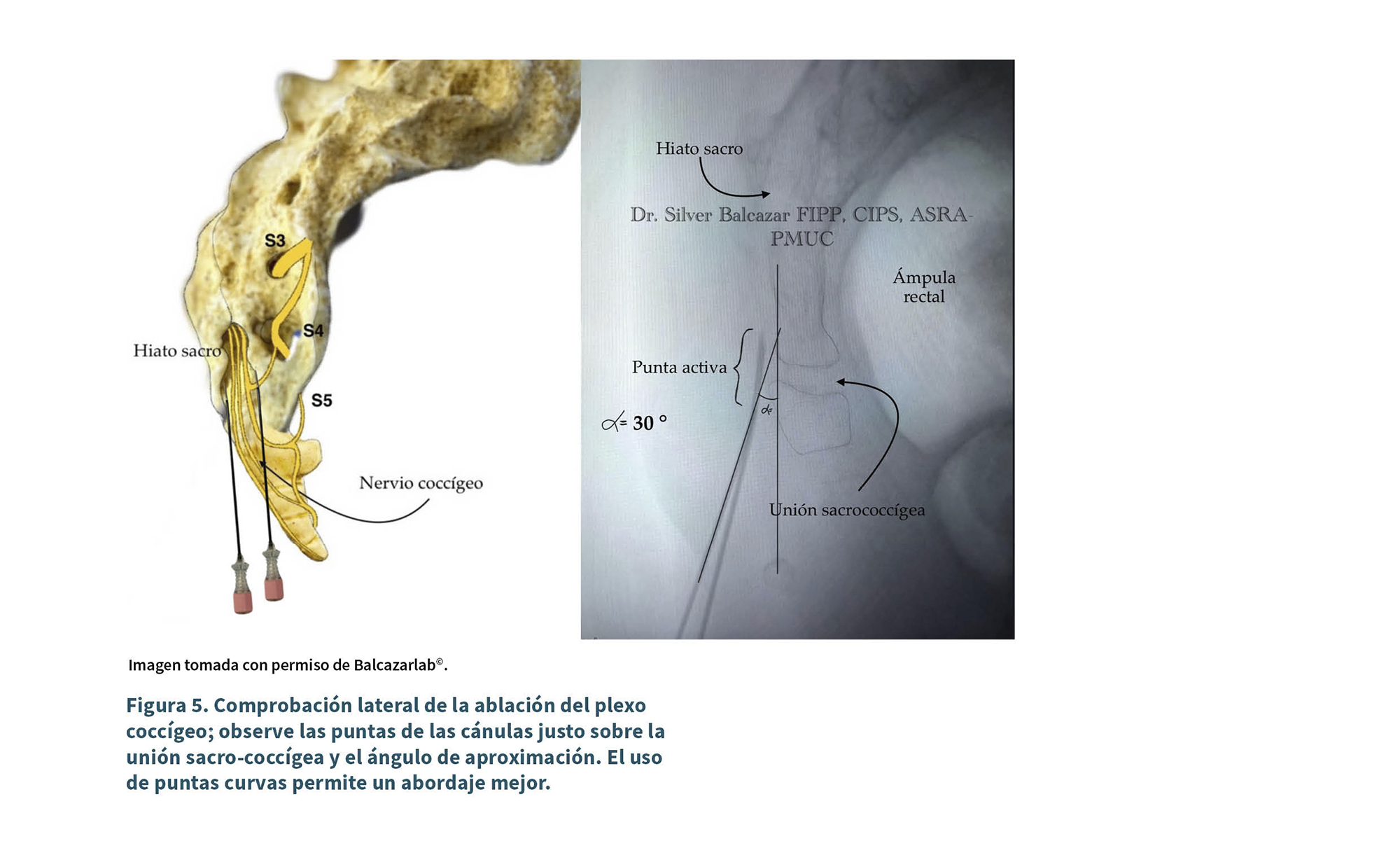 Moorman y cols. llevaron a cabo un estudio en 30 pacientes con diagnóstico de coccigodinia crónica, a los que se les administró radiofrecuencia en el aspecto dorsal de la unión sacrococcígea, y evaluaron la seguridad y efectividad de esta técnica ablativa por vía posterior, mediante guía fluoroscópica, donde se observó una reducción de más del 50 % del NRS (Numeric Rating Scale) basal en el 63,6 % de los casos para procedimientos intervencionistas de repetición, y del 33 % de los pacientes con abordajes primarios a los 3 meses (10). Algunas limitaciones del estudio de Moorman fueron muestra heterogénea, muestra pequeña y no se consideraron grupos control, además la disposición de las cánulas fue perpendicular al periostio haciendo que la superficie de lesión sea pequeña, y no se usó técnica bipolar.