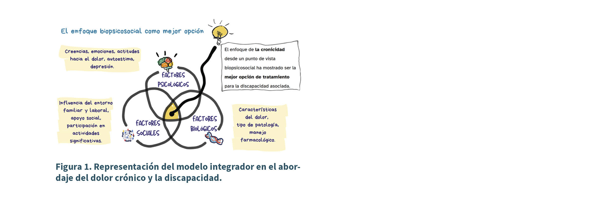 Se puede considerar el dolor crónico discapacitante cuando el dolor genera disfunción física, limitaciones en la actividad diaria y restricciones en la participación social (9,10). Desde esta perspectiva, la cronicidad debe entenderse como un proceso que abarca no solo factores médicos, sino también psicológicos y sociales (11) (Figura 1).