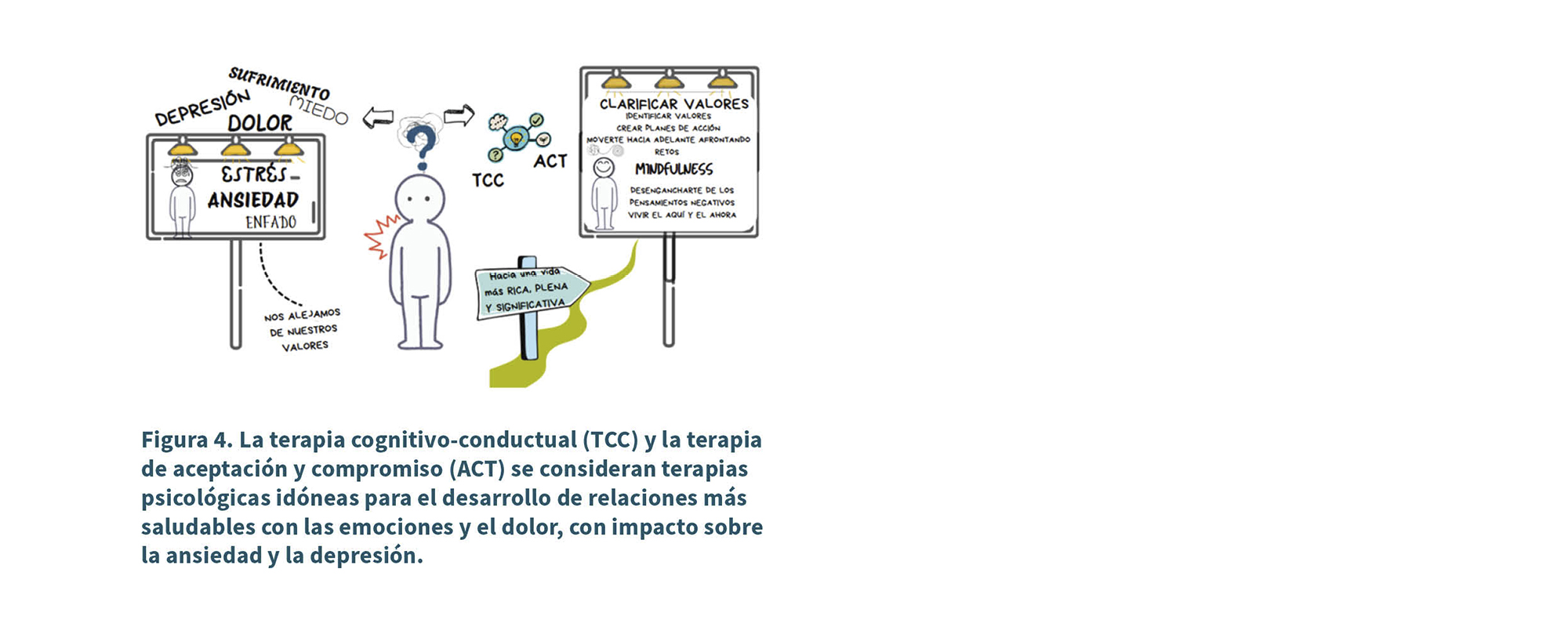 La regulación emocional hace referencia a las estrategias que usamos para modificar la intensidad, duración y calidad de nuestras respuestas emocionales (22,23). Una de estas estrategias, llamada aceptación o tolerancia al malestar según la escuela de psicoterapia, se basa en asumir el malestar como parte natural de la vida, reconociendo que no hay vida plena sin retos (24). Esta regulación emocional a través de la aceptación permite a las personas afrontar experiencias difíciles de manera más adaptativa (25). Las personas con dolor crónico a menudo se enfrentan a emociones intensas, como ansiedad y frustración. Es fundamental distinguir entre conductas guiadas por valores y aquellas impulsadas por la evitación del dolor. Por ejemplo, evitar actividades por miedo a incrementar el dolor puede ofrecer alivio temporal, pero limitar a largo plazo la calidad de vida y el bienestar emocional (26). La terapia cognitivo-conductual (TCC) y la terapia de aceptación y compromiso han demostrado ser eficaces en la regulación emocional en dolor crónico (21) (Figura 4).