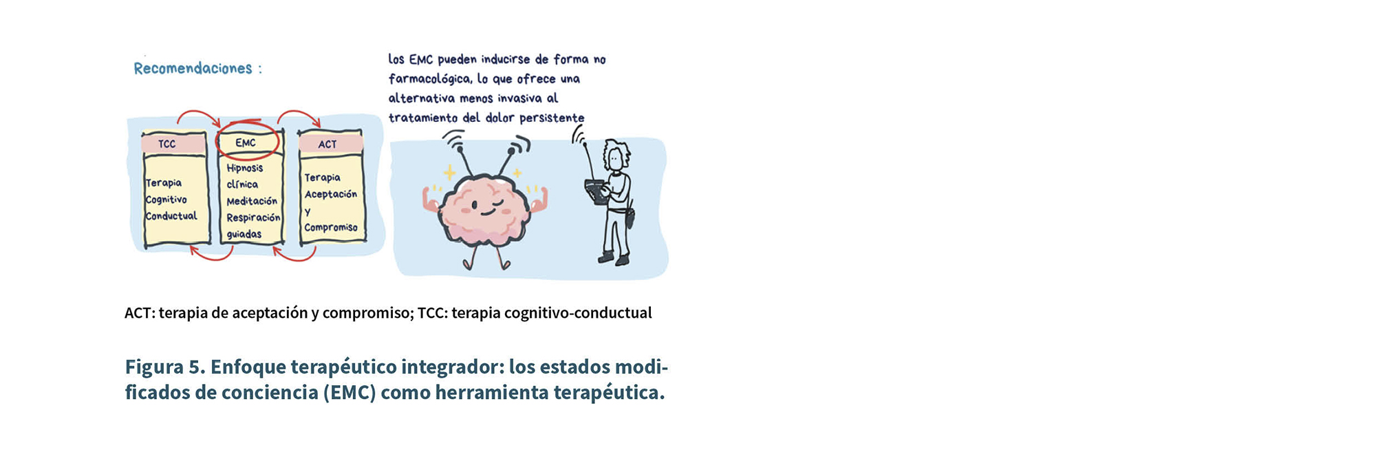 El uso de estados modificados de conciencia (EMC) en el tratamiento del dolor crónico incluye técnicas como la hipnosis clínica, la meditación, la imaginación guiada y la respiración controlada (28). Combinados con terapias convencionales como la TCC o la terapia de aceptación y compromiso, entre otras, los EMC alteran la percepción y la respuesta cerebral al dolor, facilitando cambios emocionales y psicológicos y aumentando la eficacia terapéutica (29,30) (Figura 5).