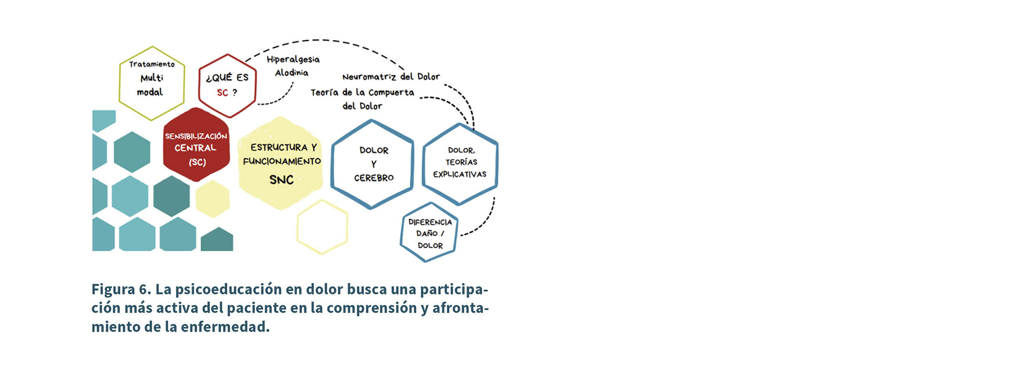 Comprender estos procesos ayuda a las personas a reducir la catastrofización y el miedo al movimiento. La psicoeducación también promueve una visión integral del dolor, abarcando sus componentes físicos, emocionales y cognitivos, y facilita una intervención multidisciplinar coordinada entre los profesionales de la salud (36) (Figura 6).