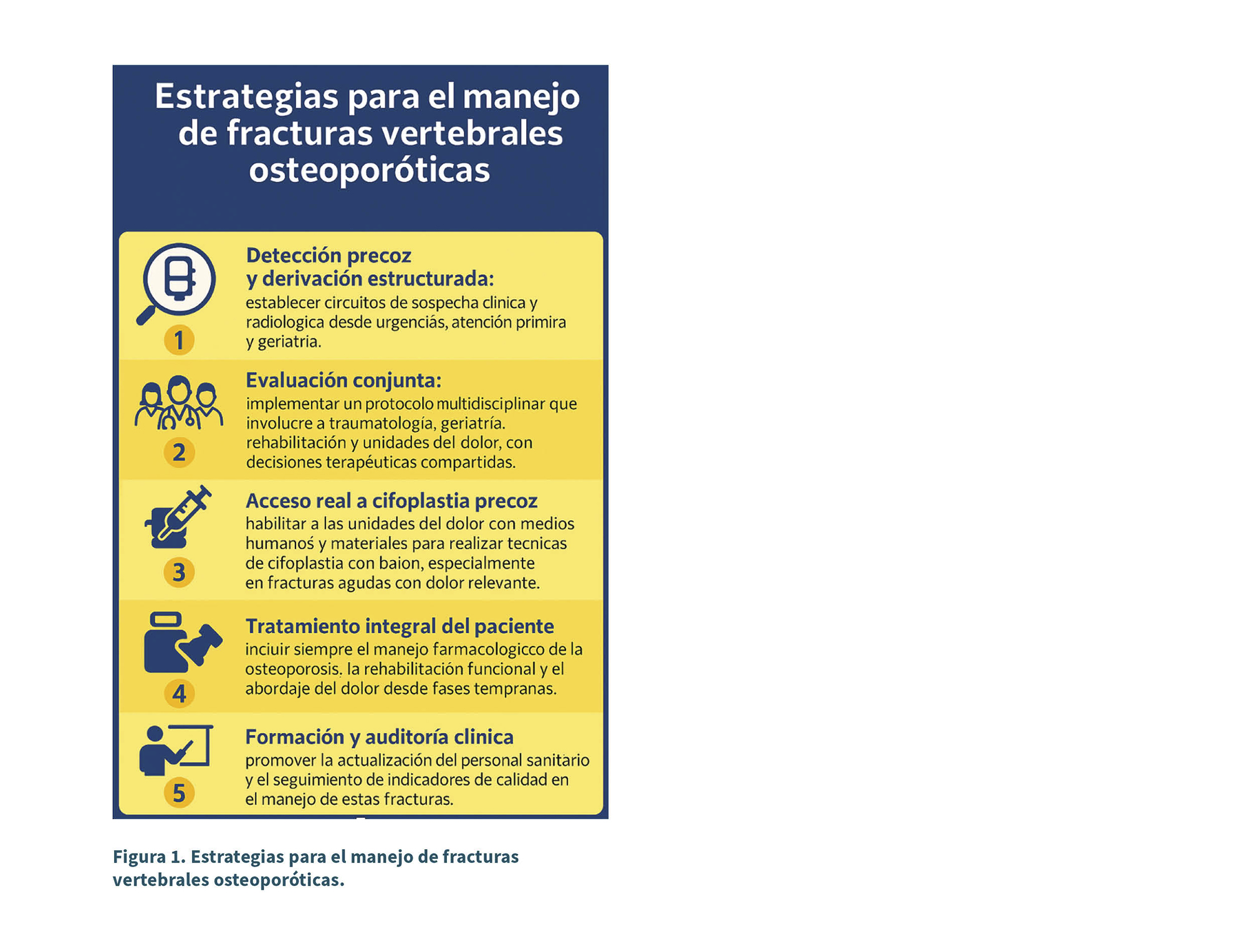 Las FVO son frecuentes, infradiagnosticadas y mal abordadas en muchos contextos clínicos, lo que repercute en el pronóstico funcional, psicológico y social de los pacientes. La evidencia de nivel IA apoya el uso de la cifoplastia con balón en fracturas recientes con dolor severo, permitiendo una recuperación funcional más rápida y una reducción de la dependencia. Sin embargo, su uso sigue siendo limitado en diversas regiones por barreras organizativas y falta de reconocimiento institucional del papel de las unidades del dolor en este tratamiento. La implementación de protocolos multidisciplinares y la dotación de recursos equitativos son medidas urgentes para garantizar una atención homogénea en todo el territorio. El tratamiento del dolor no puede seguir siendo una opción tardía ni condicional, sino parte esencial del abordaje precoz de estas fracturas (Figura 1).