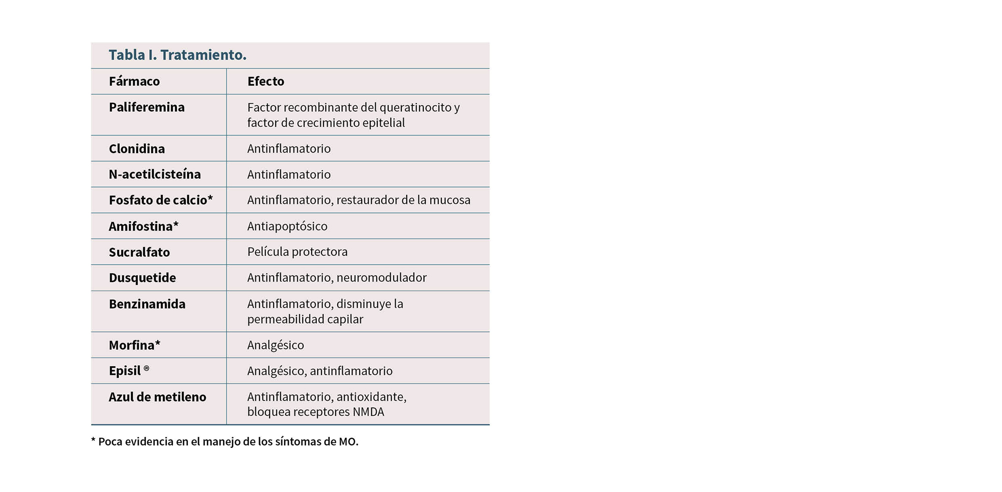 Se han empleado múltiples fármacos, entre los cuales la paliferemina es un factor recombinante del queratocito y factor de crecimiento epitelial, se recomienda en dosis de 60 mcg/kg/día, ya que previene las formas severas de MO por sus efectos antinflamatorio, antiapoptótico y antioxidativo (21). La clonidina mostró efectividad en dosis de 50-100 mcg/kg/día en presentación de tabletas mucoadhesivas, en un estudio en fase II (45). La N-acetilcisteína también ha mostrado efecto sobre el alivio de los síntomas de la MO (46). El sucralfato en gel puede usarse en formas leve de MO (50). La talidomida ha demostrado disminuir la aparición de formas graves de la enfermedad (57). La benzidamina inhibe la producción de prostaglandinas y además disminuye la permeabilidad capilar (58). Otros fármacos han mostrado evidencia moderada en el manejo de los síntomas de la MO, como lo son alopurinol, eritropoyetina, Episil® (60,61,63). Por último, el fosfato de calcio, la amifostina, la morfina en enjuagues bucales, la gabapentina, clorhexidina, los AINE, prednisona, iodo povidona y pilocarpina no han reportado suficiente evidencia en el tratamiento de los síntomas de la MO (2,47,20,52-56,59,62) (Tabla I).