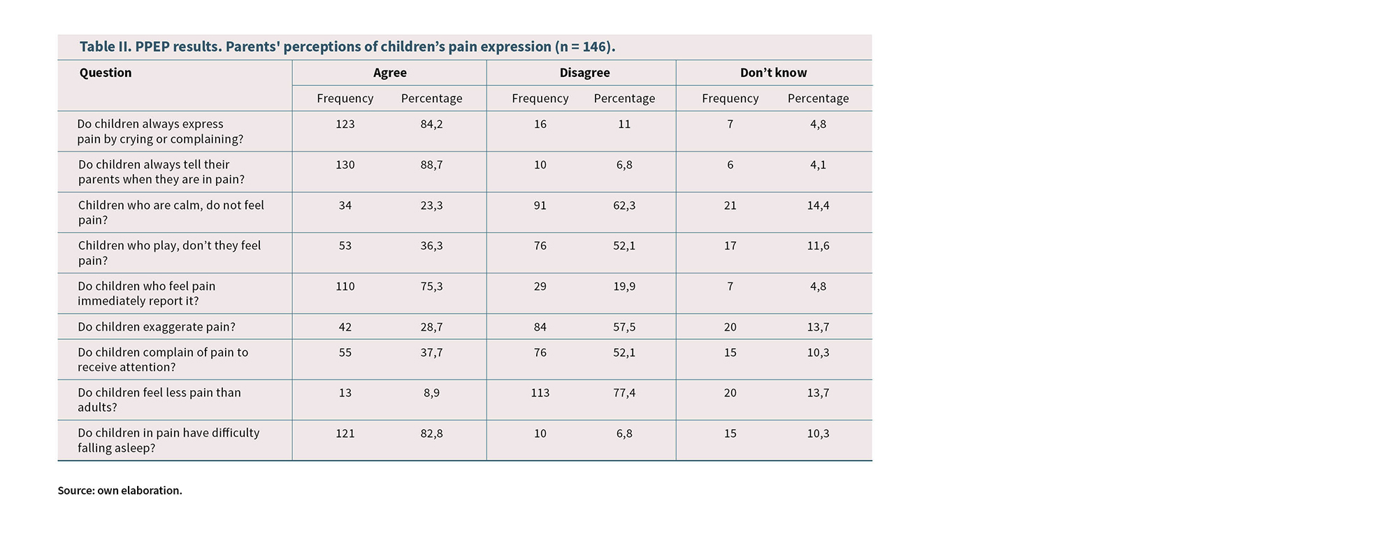 Responses to the PPEP questionnaire - Parents’ perceptions of pain expression. Table II shows the caregivers’ responses. It can be seen that 88.7 % of caregivers agreed that children always tell their parents when they are in pain, 84.2 % reported that children always express pain by complaining, and 82.6 % stated that children in pain have difficulty falling asleep. 62.3 % disagreed that children do not feel pain when they are calm. While 77.4 % disagreed that children experience less pain than adults, nearly a third of participants believed that children exaggerate pain, and 37.7 % said they complain of pain to receive care.