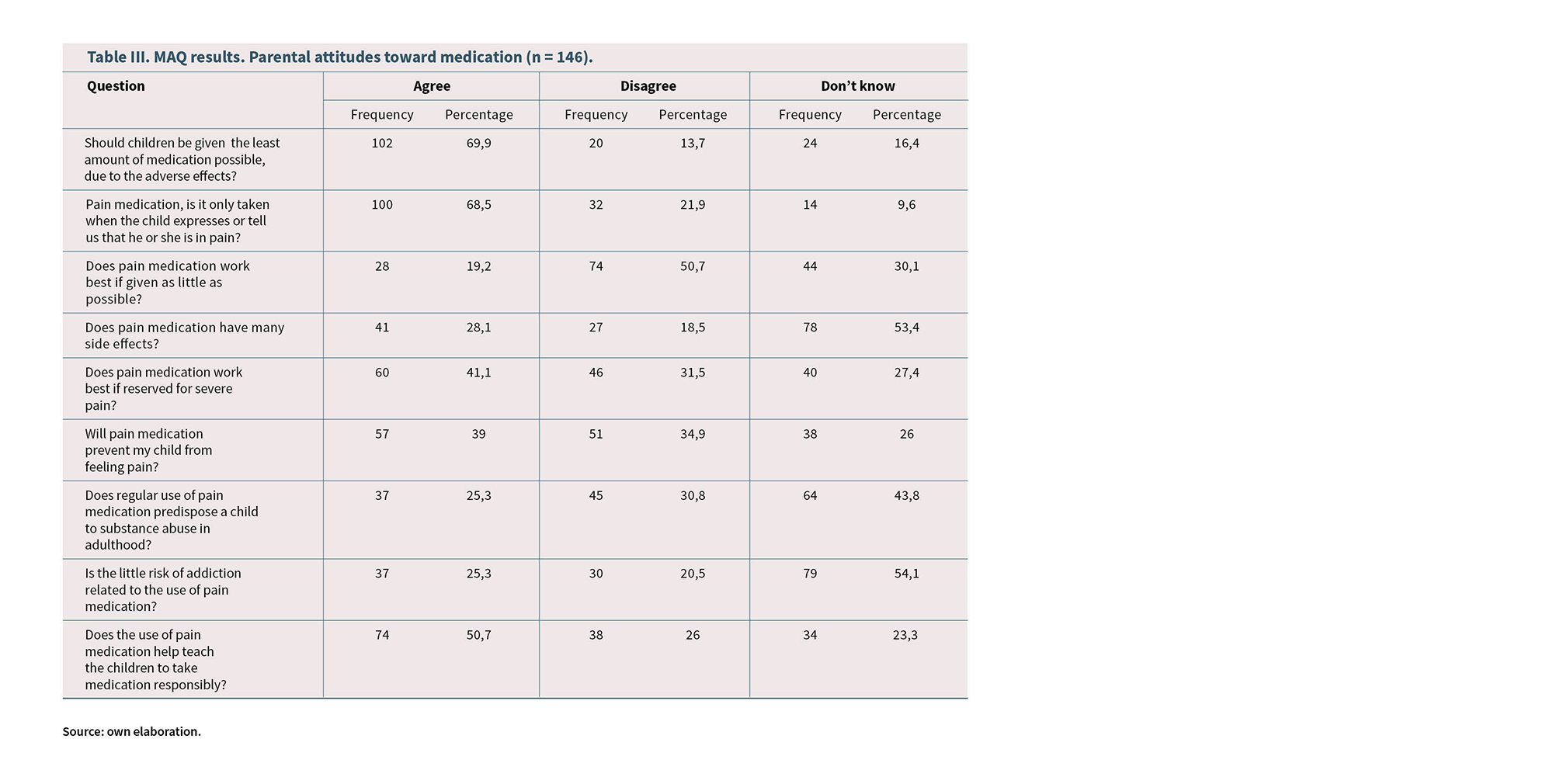 Responses to the MAQ questionnaire - Attitudes toward medication. Table III shows caregivers’ responses regarding the use of pain medication.