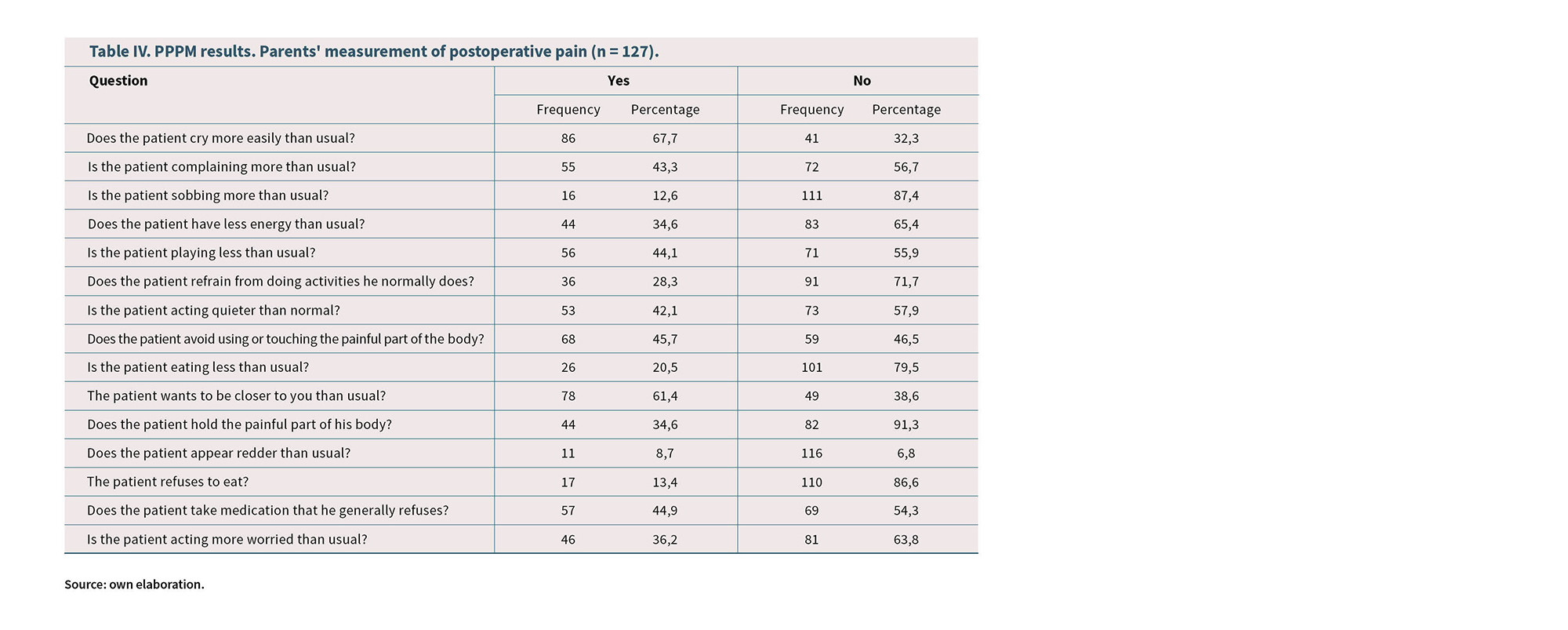 Finally, the results gathered from the last questionnaire revealed that patients avoided touching or moving the surgical area and sought greater proximity to their caregivers during the postoperative period. Similarly, it was found that appetite was not affected postoperatively and that although they cried more than usual, the children retained their energy. These results are similar to those of the Chambers group, who reported that 59.3% of children avoided touching the painful area, 52.3 % played less than usual, and 50.9% had less energy than usual. Our results showed a higher proportion of parents who reported that their children sought their closeness more than usual